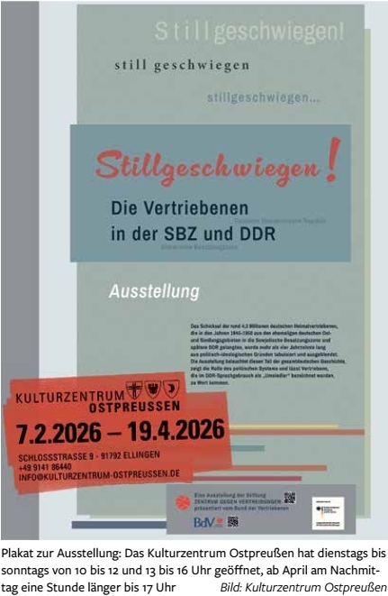 Stillgeschwiegen – Die Vertriebenen in der SBZ und DDR, Ausstellung vom 7. Februar bis zu 19. April. Eine wichtige gesellschaftliche Gruppe in der DDR, die bis 1989 nicht als Gruppe auftreten durfte, waren die ca. 4,3 Millionen deutschen Heimatvertriebenen, die mit dem Ende des Zweiten Weltkrieges durch Flucht oder Vertreibung in die damalige Sowjetische Besatzungszone (SBZ) gelangten. Mehr als vier Jahrzehnte lang wurde das Lebensschicksal dieser Menschen ausgeblendet und in die private, familiäre Erinnerung abgedrängt. Die politisch verordnete Verschmelzung der Vertriebenen mit der DDR-Gesellschaft und auch deren wirtschaftliche Etablierung mag oberflächlich betrachtet gelungen sein. Eine emotionale und historische Aufarbeitung, die das subjektive Empfinden über die offizielle Negierung des traumatischen Schicksals berücksichtigt, Empathie erzeugt und Interesse am Thema zugelassen hätte, fand bisher nur unzureichend statt.