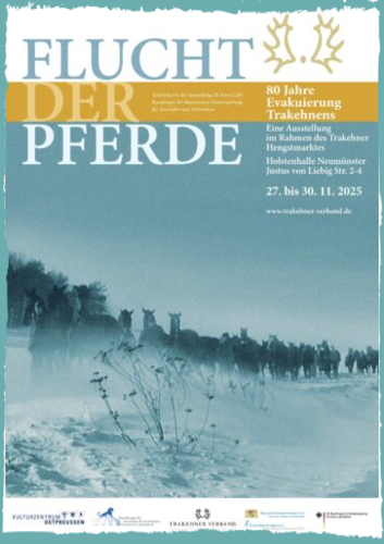 Der Trakehner Hengstmarkt, der seine historischen Ursprünge in Insterburg und Königsberg hat, präsentiert in diesem Jahr nicht nur über 80 Pferde ostpreußischer Abstammung, sondern auch eine Ausstellung unter dem Titel „Flucht der Pferde“. Schauplatz dieser Veranstaltung ist vom 27. bis zum 30. November 2025 die Holstenhalle der Stadt Neumünster, wo der Trakehner Hengstmarkt seit über 60 Jahren stattfindet. Damit kommt die Trakehner Zucht auch ihrer Aufgabe als Immaterielles Kulturerbe im Verzeichnis der UNESCO nach.